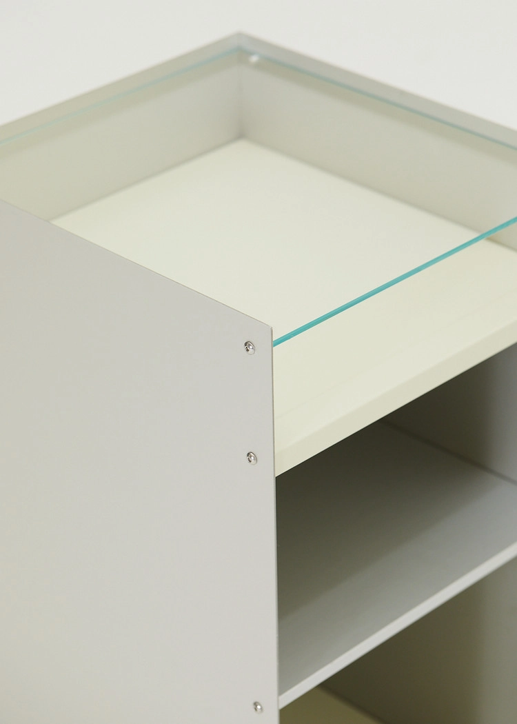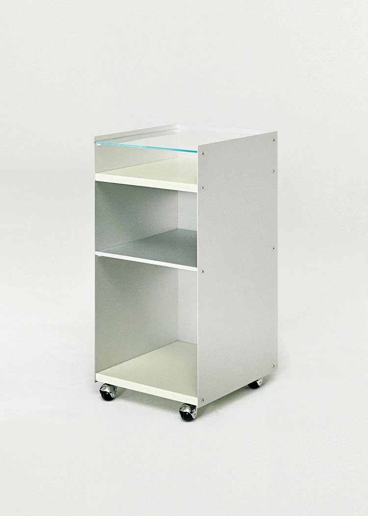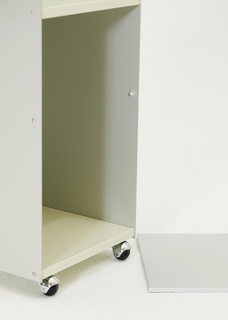 상단 클리어유리 선반엔 자주 사용하는 물품들을 올려둘 수 있고, 쉽게 떨어지지 않도록 턱이 있습니다. 바로 아래의 수납 공간에는 마음에 드는 책이나 작은 물품 등 을 디스플레이 할 수 있습니다. 중간 알류미늄 트레이는 자유롭게 뺏다 꼈다 할 수 있어 부피가 있는 물품을 효율적으로 정리, 보관할 수 있도록 설계되었으며 바퀴가 있어 이동이 용이합니다. 오피스나 서재 또는 주방에서 특히 쓰임이 좋은 제품입니다.